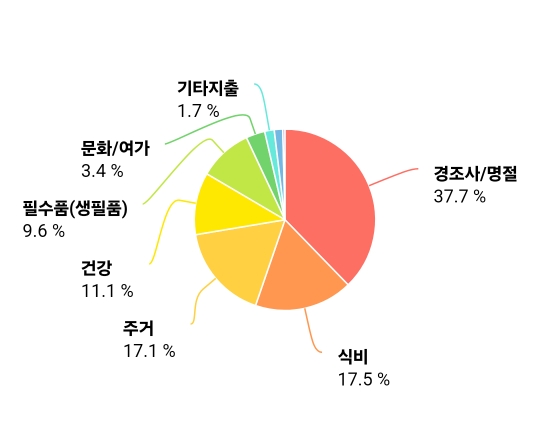매달의 수입과 지출 내역은 이렇게 통계를 통해 한눈에 볼 수 있습니다. 이건 저희 집 2월 지출 내역인데 설이 있어서 경조사/명절 비용이 가장 많이 들었습니다. 이렇게 퍼센트로 보여주니 어느 항목에서 지출이 가장 많은지를 딱 알아볼 수 있어서 편하고 예상외로 지출이 많이 된 부분은 반성과 피드백도 하게 되어서 좋았습니다.