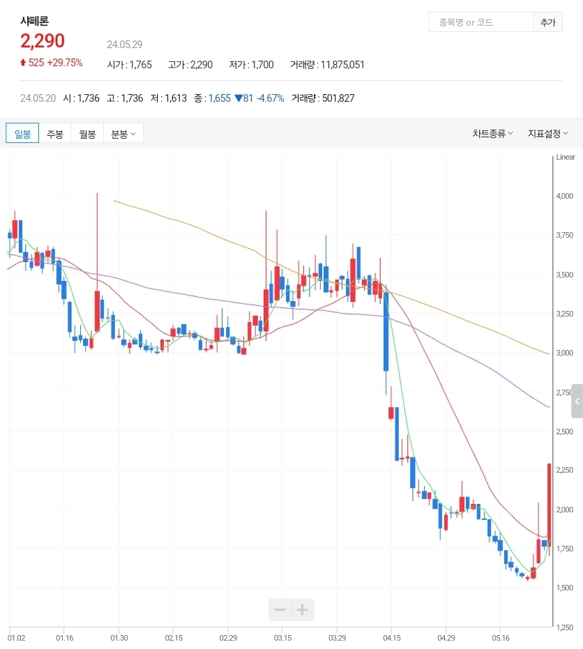 3. 샤페론 - 상승률 29.75% / 거래량 1187만 주