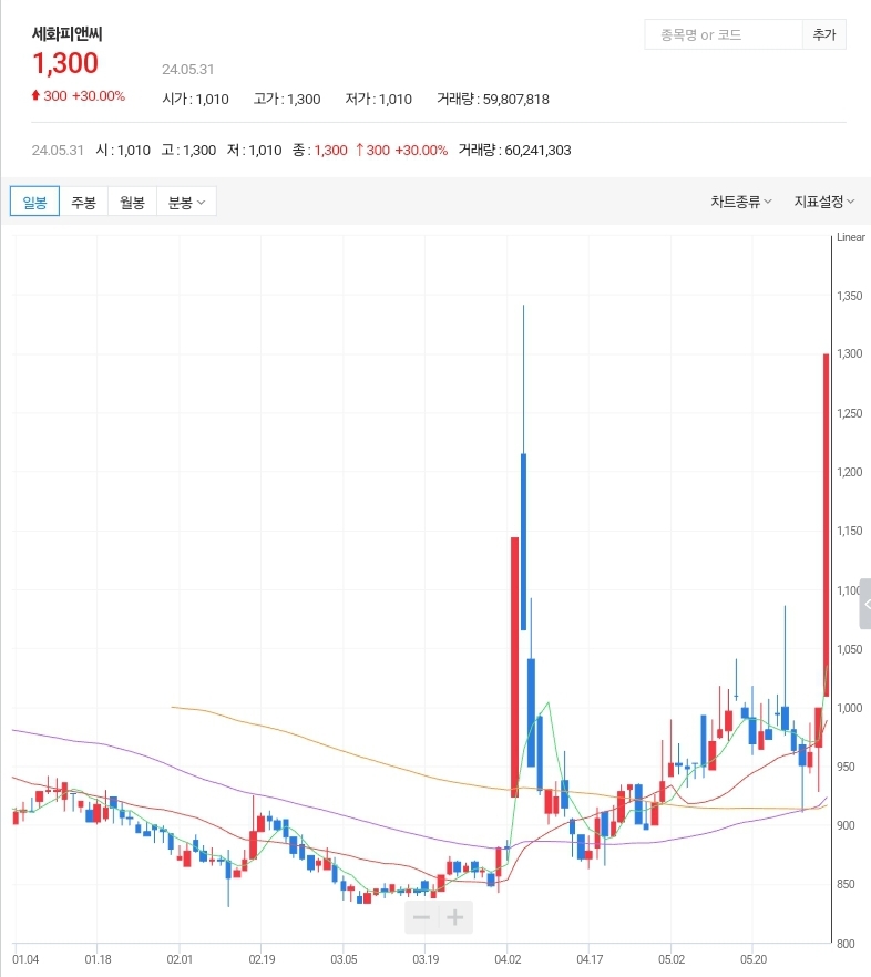 3. 세화피앤씨 - 상승률 30.00% / 거래량 6018만 주
