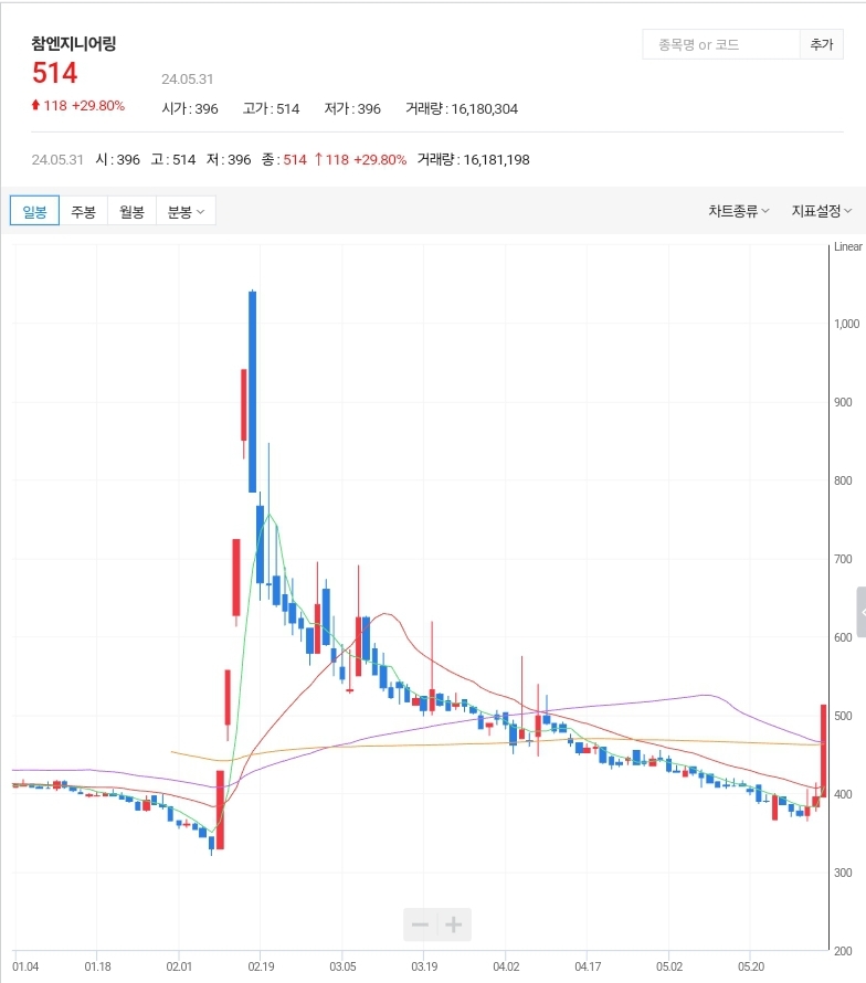 2. 참엔지니어링 - 상승률 29.80% / 거래량 1618만 주