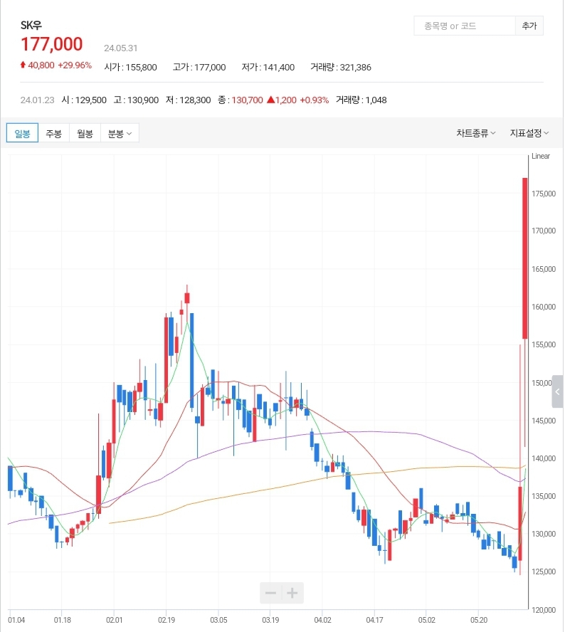 1. SK우 - 상승률 29.96% / 거래량 32만 주