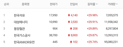 석유, 가스 관련 주: 한국가스공사, 대성에너지. 흥구석유, 한국석유, 한국ANKOR유전 상한가 기록