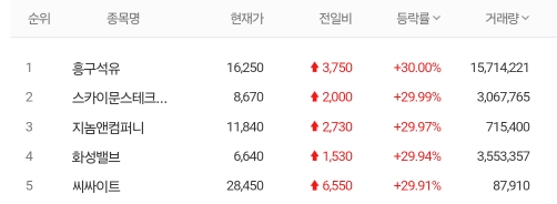 석유, 가스 관련 주: 한국가스공사, 대성에너지. 흥구석유, 한국석유, 한국ANKOR유전 상한가 기록