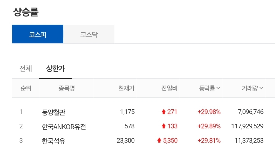 1) 코스피 상한가