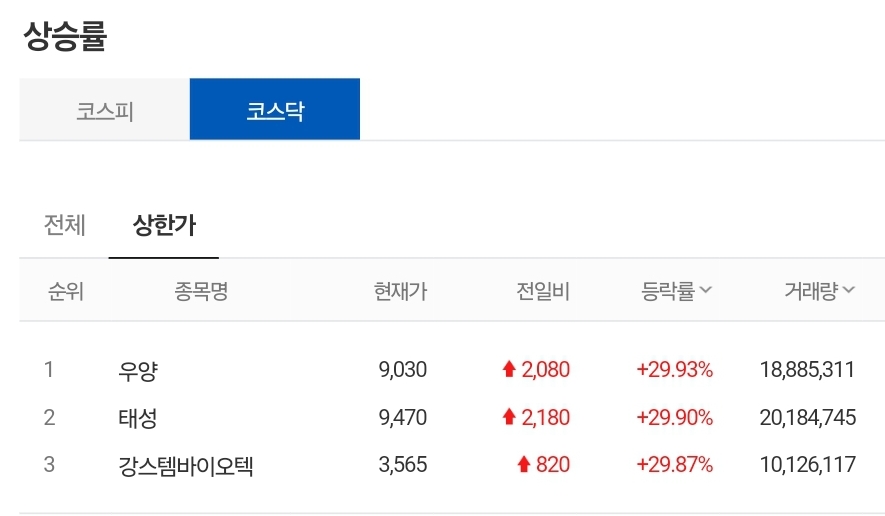 2) 코스닥 - 우양/태성/강스템바이오텍 상한가